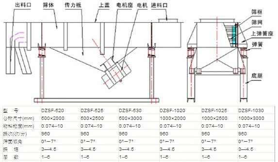 當縱向安裝在篩體上的兩臺振動電機兩端的偏心塊便產生額定激振力,其產生在橫向的激振力相互抵銷,其縱向的激振力通過傳振體傳遞到整個篩面上,從而使篩面上的物料受其激振力而在篩網面上向出料口方向跳躍運動。小于篩孔的物料通過篩孔落到下層,大于篩孔的物料經連續跳躍后,經出料口流出,由于篩分過程合理,可將物料經振動篩分級后,取得幾種不同顆粒的物料,完成物料的分級。